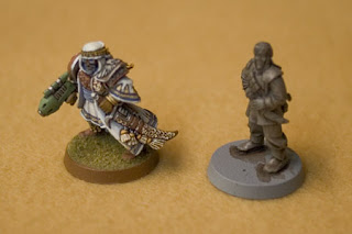 Terrain:on my side I had a ruin in the left center, and a copse of trees in the right side, about 6" from the table edge. There were 3story ruins in on the left side about 6" in from edge in the middle of the board, and ruins about 12" in from that, just to the left of true center of the 6"x4" board. in the right middle of the board was a shale outcropping. There were some ruins on Buckler's side in the center, but we really didn't spend ANY time over on that side of the board.