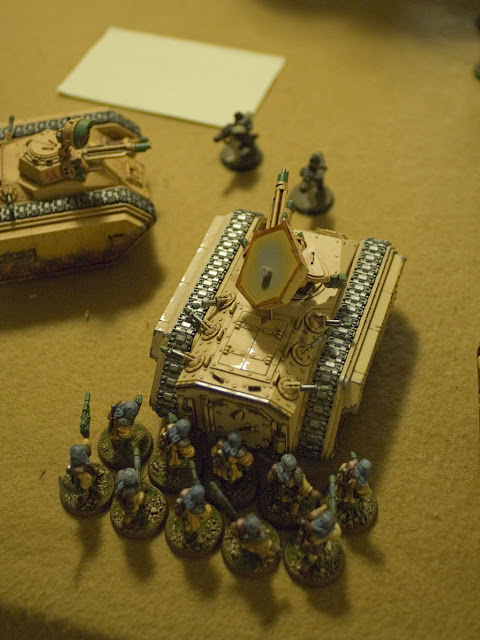 The Demolisher uses it's heavy flamer to torch the =][= Lord's squad. The Demolisher cannon then scatters onto his Chimera, blowing it up. Looking around for "craters" to use, we settle on some rectangular post-it notes. You'll be seeing a lot of those in this battle. :)